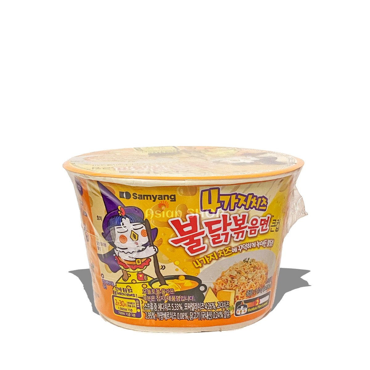 Zloženie:rezance (PŠENIČNÁ MÚKA (z USA), palmový olej (z Malajzie), modifikovaný škrob 1, zemiakový škrob, modifikovaný škrob 2, rafinovaná soľ, SEZAMOVÝ OLEJ, alkalické činidlo s pridaným cukrom do rezancov (uhličitan draselný, uhličitan sodný, hydrogenfosforečnan sodný), guarová guma, olej s príchuťou zeleného čaju, vitamín B2, kyselina citrónová)). Tekutá omáčka (čistená voda, rafinovaný cukor, umami základ, pikantná SYROVÁ OMÁČKA, SÓJOVÁ OMÁČKA SAMYANG, SÓJOVÝ OLEJ, hovädzí extrakt, kurací aromatický prášok, korenie habanero, cesnak, cibuľa, prášok z pikantnej papriky, modifikovaný škrob 2, rafinovaná soľ, odfarbený čili extrakt, extrakt z papriky, fermentačný prášok s mliečnymi baktériami)). Práškový základ (MOZARELLA SYROVÝ PRÁŠOK (tavený syr (MOZARELLA SYR z USA), palmový olej (Malajzia), SUŠENÉ ODSTREDENÉ MLIEKO, dextrín, kazeinát sodný), zmes syrového korenia, rafinovaný cukor, rafinovaná soľ, SÓJOVÝ OLEJ)).